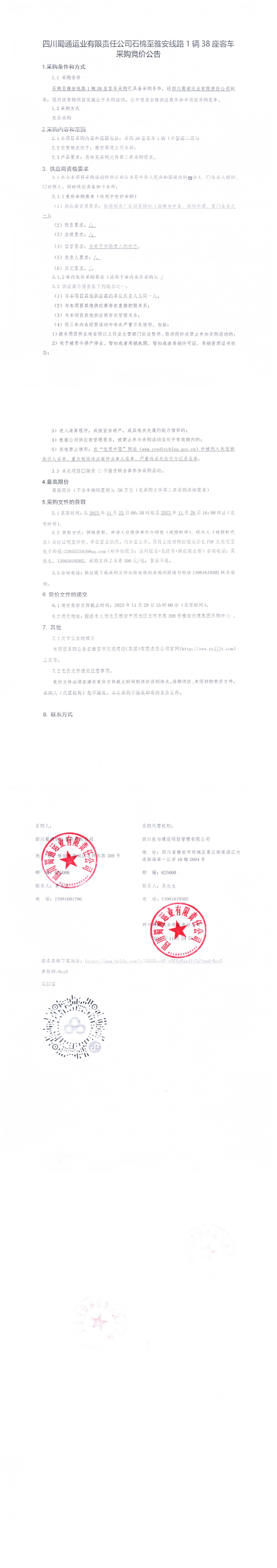 四川蜀通運(yùn)業(yè)有限責(zé)任公司石棉縣至雅安線路1輛38座客車采購(gòu)競(jìng)價(jià)公告