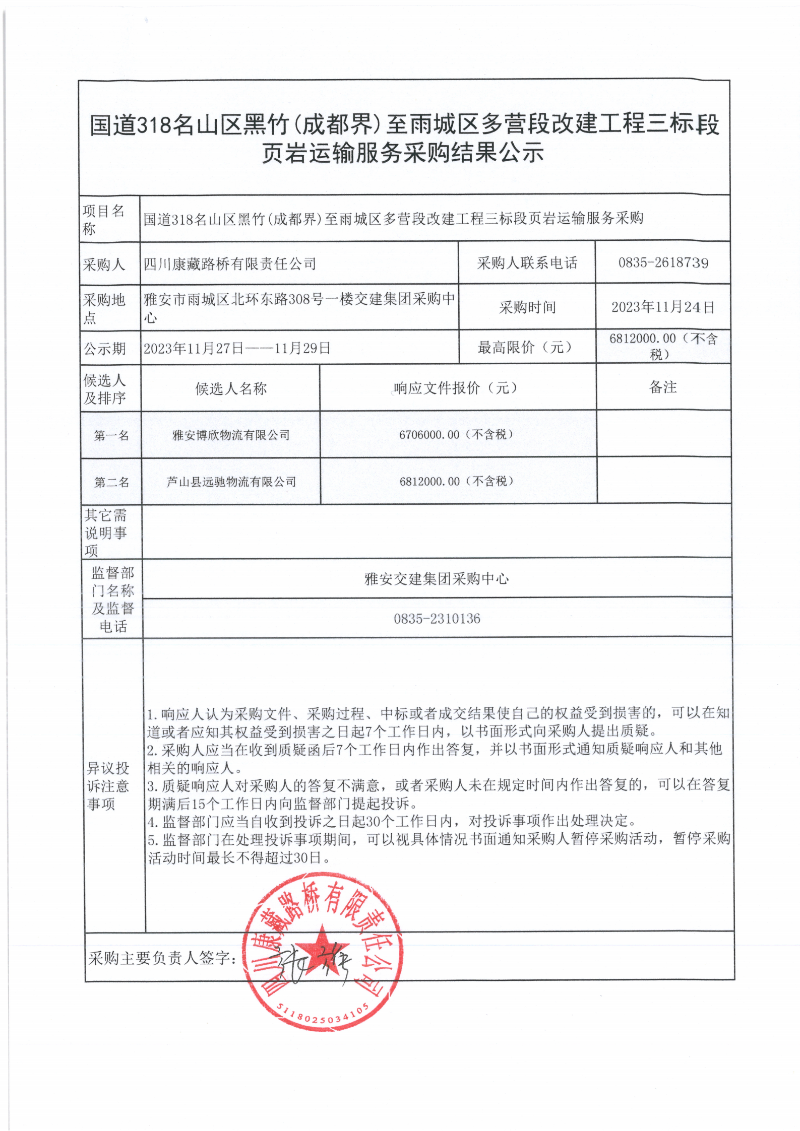 四川康藏路橋有限責任公司國道318名山區(qū)黑竹(成都界)至雨城區(qū)多營段改建工程三標段頁巖運輸服務采購結果公示