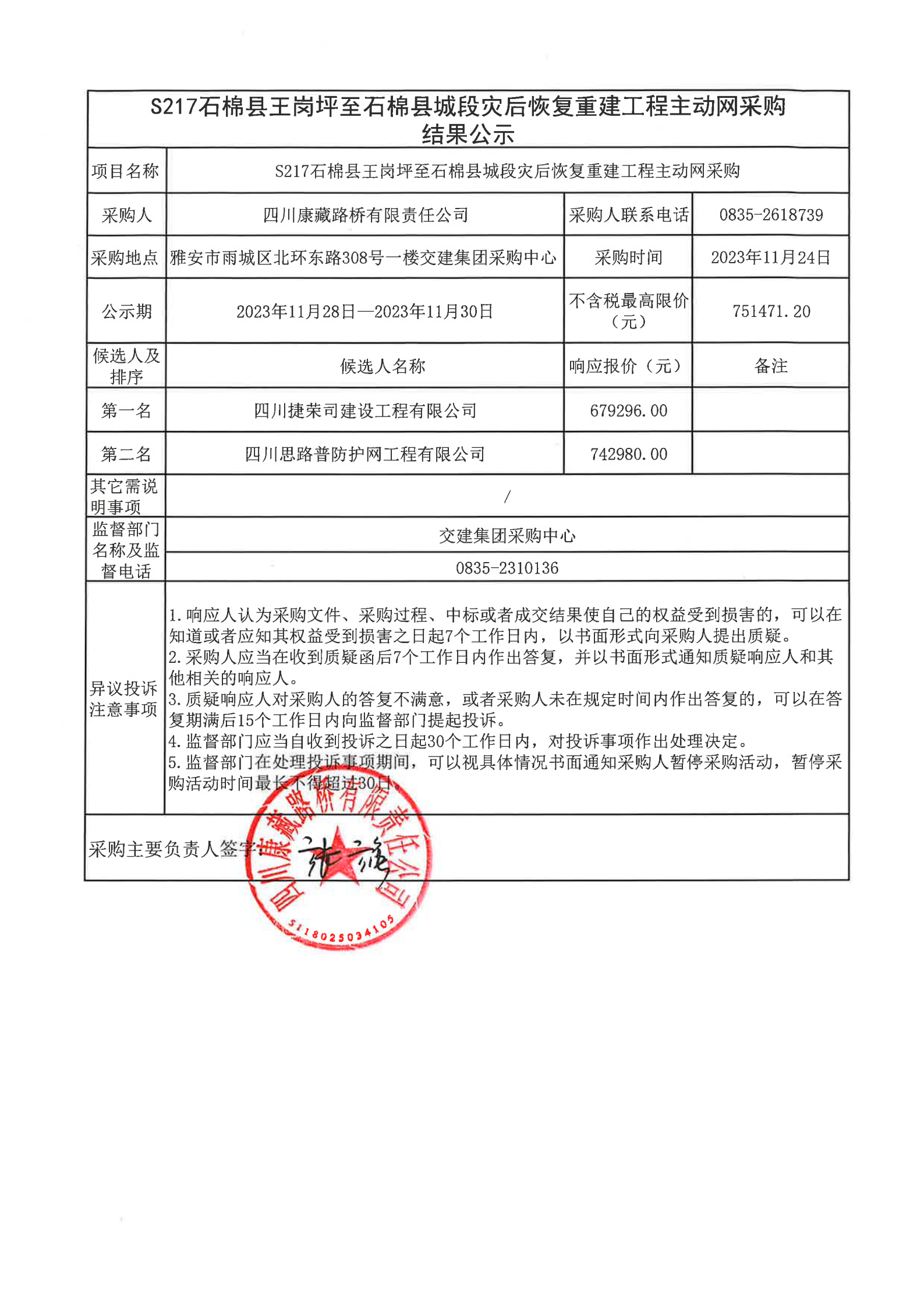 四川康藏路橋有限責任公司S217石棉縣王崗坪至石棉縣城段災后恢復重建工程主動網采購結果公示