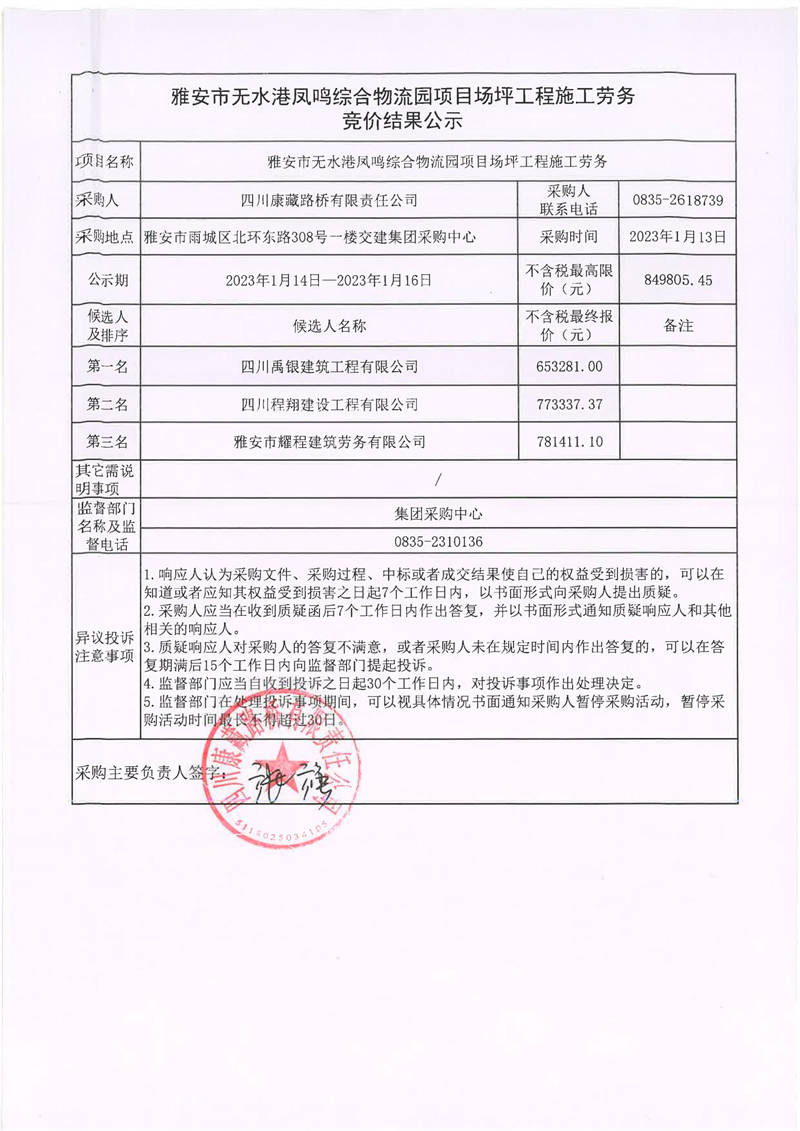 四川康藏路橋有限責(zé)任公司雅安市無水港鳳鳴綜合物流園項(xiàng)目場坪工程施工勞務(wù)競價(jià)結(jié)果公示