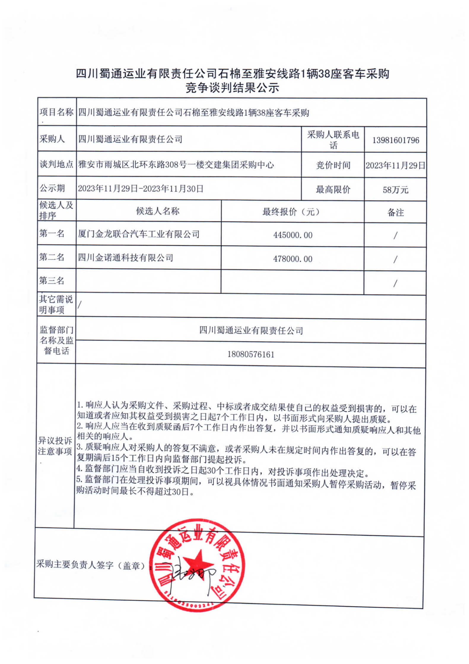 四川蜀通運(yùn)業(yè)有限責(zé)任公司石棉至雅安線路1輛38座客車采購競(jìng)爭(zhēng)談判結(jié)果公示