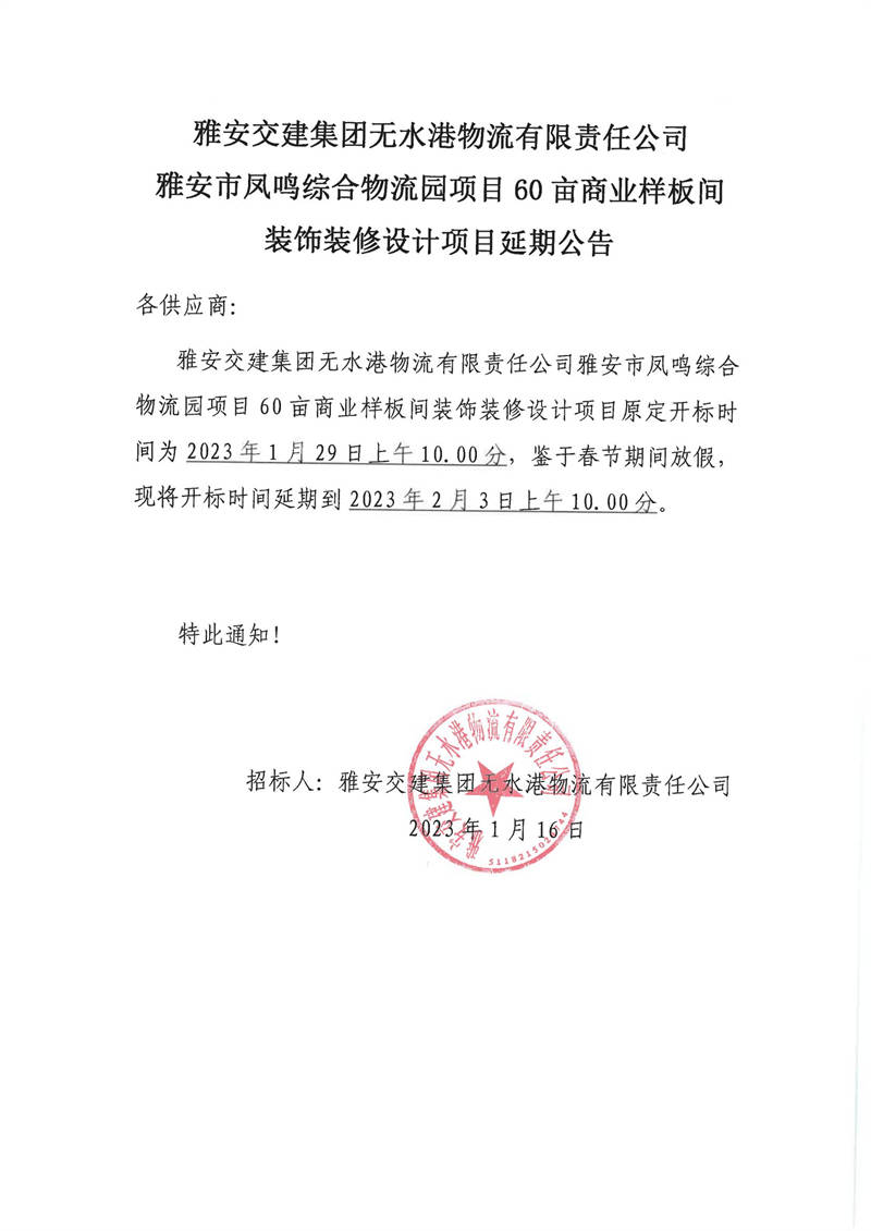 雅安交建集團無水港物流有限責任公司雅安市鳳鳴綜合物流園項目60畝商業(yè)樣板間裝飾裝修設計項目延期公告