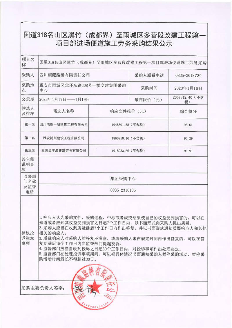 四川康藏路橋有限責(zé)任公司國(guó)道318名山區(qū)黑竹(成都界)至雨城區(qū)多營(yíng)段改建工程第一項(xiàng)目部進(jìn)場(chǎng)便道施工勞務(wù)采購(gòu)結(jié)果公示