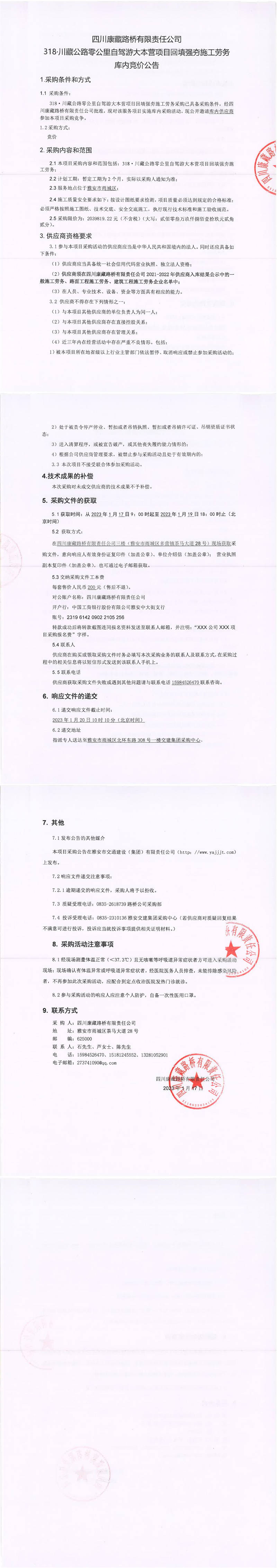 四川康藏路橋有限責任公司國道318名山區(qū)黑竹(成都界)至雨城區(qū)多營段改建工程第一項目部進場便道施工勞務采購結(jié)果公示