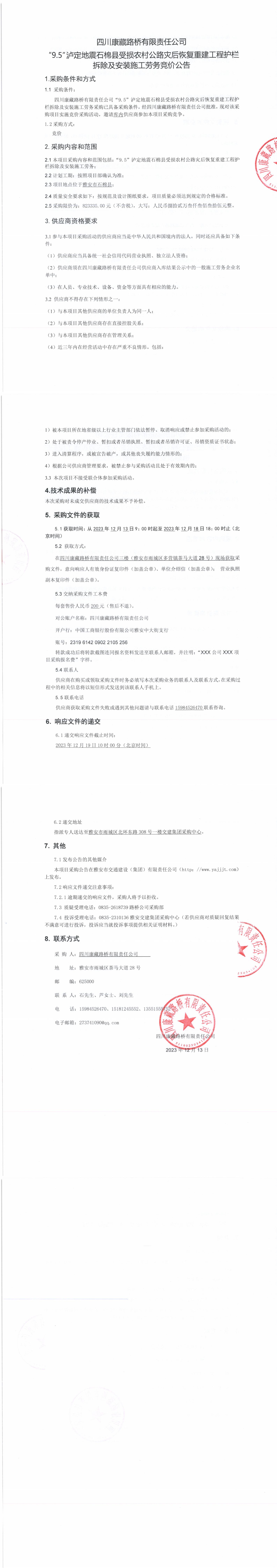 四川康藏路橋有限責任公司“9.5”瀘定地震石棉縣受損農(nóng)村公路災后恢復重建工程護欄拆除及安裝施工勞務競價公告