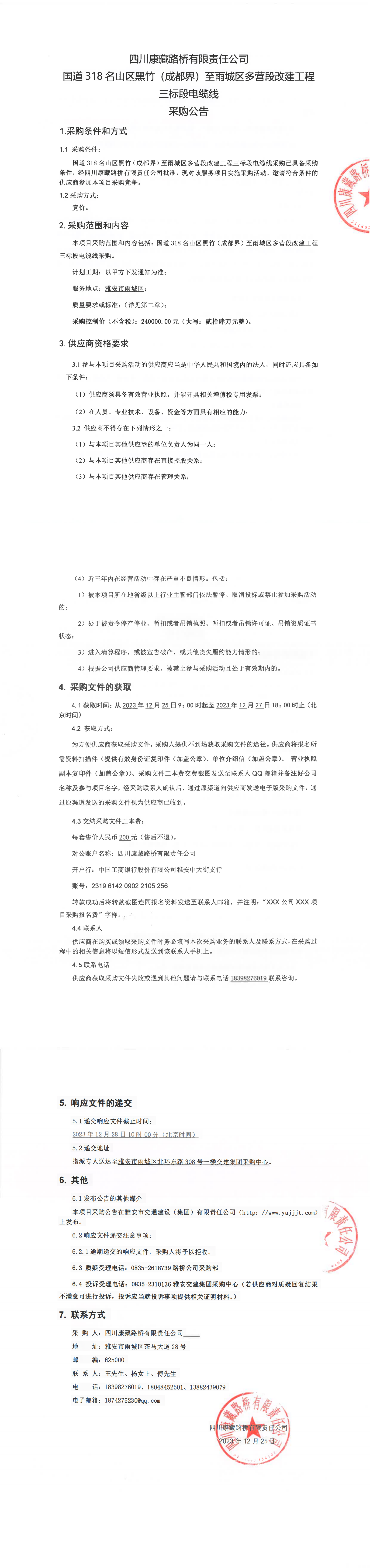 四川康藏路橋有限責(zé)任公司國(guó)道318名山區(qū)黑竹(成都界)至雨城區(qū)多營(yíng)段改建工程三標(biāo)段電纜線采購(gòu)公告
