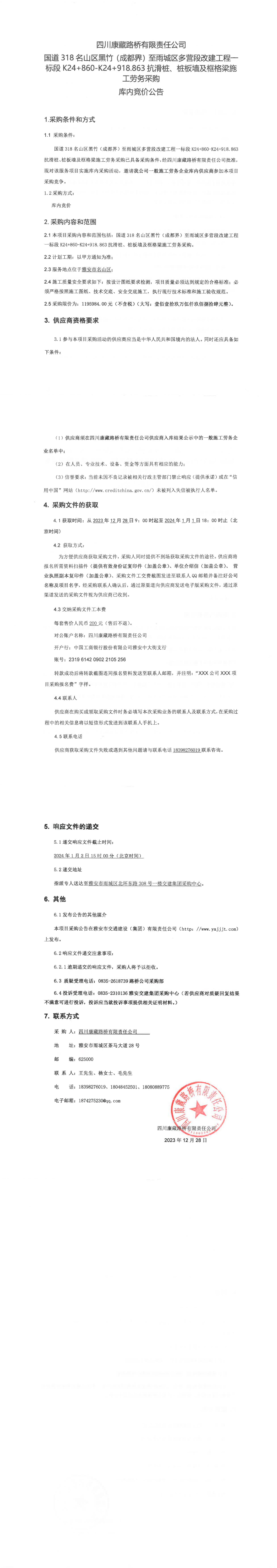 四川康藏路橋有限責任公司國道318名山區(qū)黑竹(成都界)至雨城區(qū)多營段改建工程一標段K24+860-K24+918.863抗滑樁、樁板墻及框格梁施工勞務采購庫內(nèi)競價公告