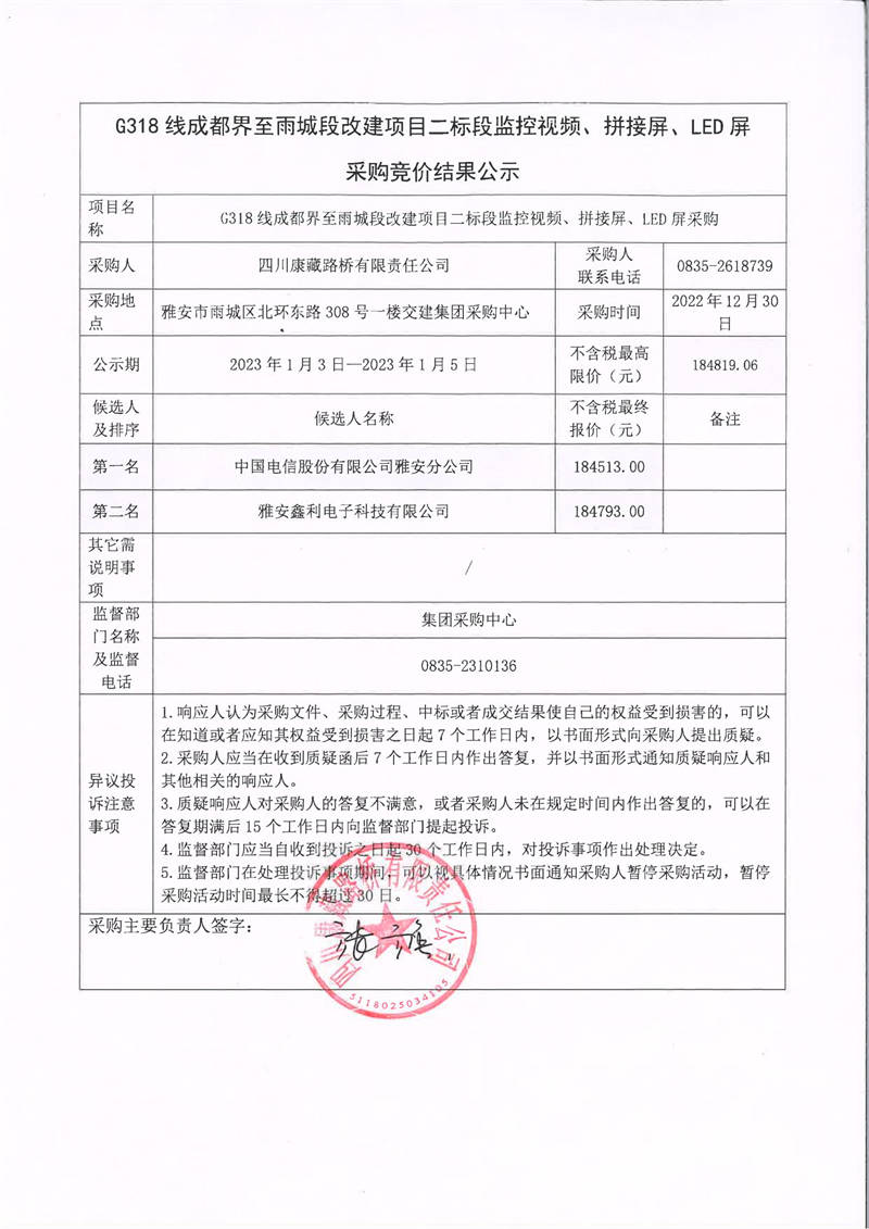 四川康藏路橋有限責任公司G318線成都界至雨城段改建項目二標段監(jiān)控視頻、拼接屏、LED屏采購競價結果公示