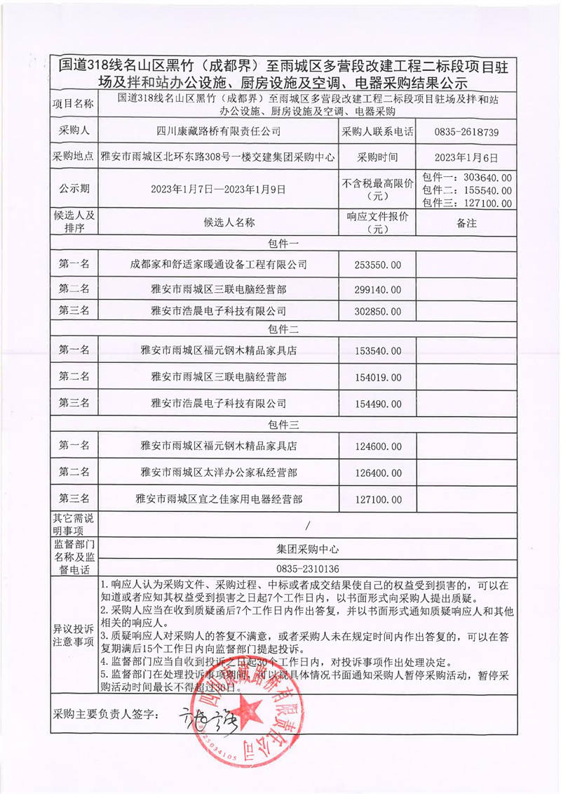 四川康藏路橋有限責(zé)任公司國(guó)道318線名山區(qū)黑竹(成都界)至雨城區(qū)多營(yíng)段改建工程二標(biāo)段項(xiàng)目駐場(chǎng)及拌和站辦公設(shè)施、廚房設(shè)施及空調(diào)、電器采購(gòu)結(jié)果公示