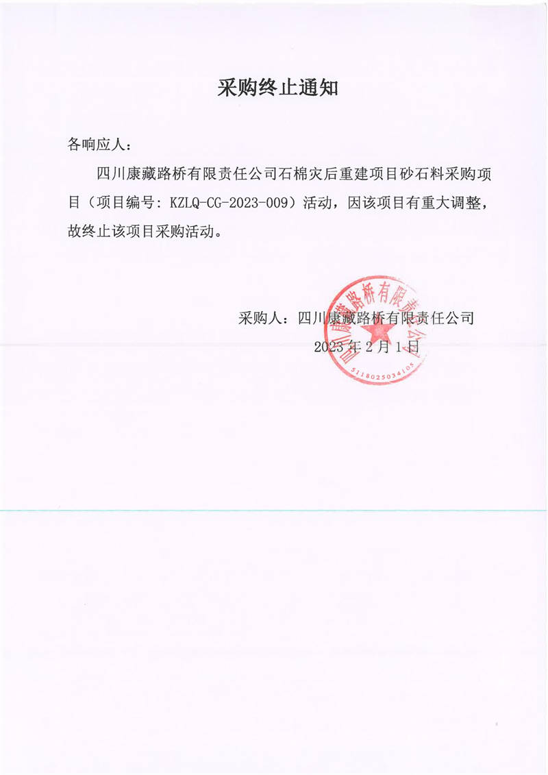 四川康藏路橋有限責(zé)任公司石棉災(zāi)后重建項目砂石料采購項目采購終止通知
