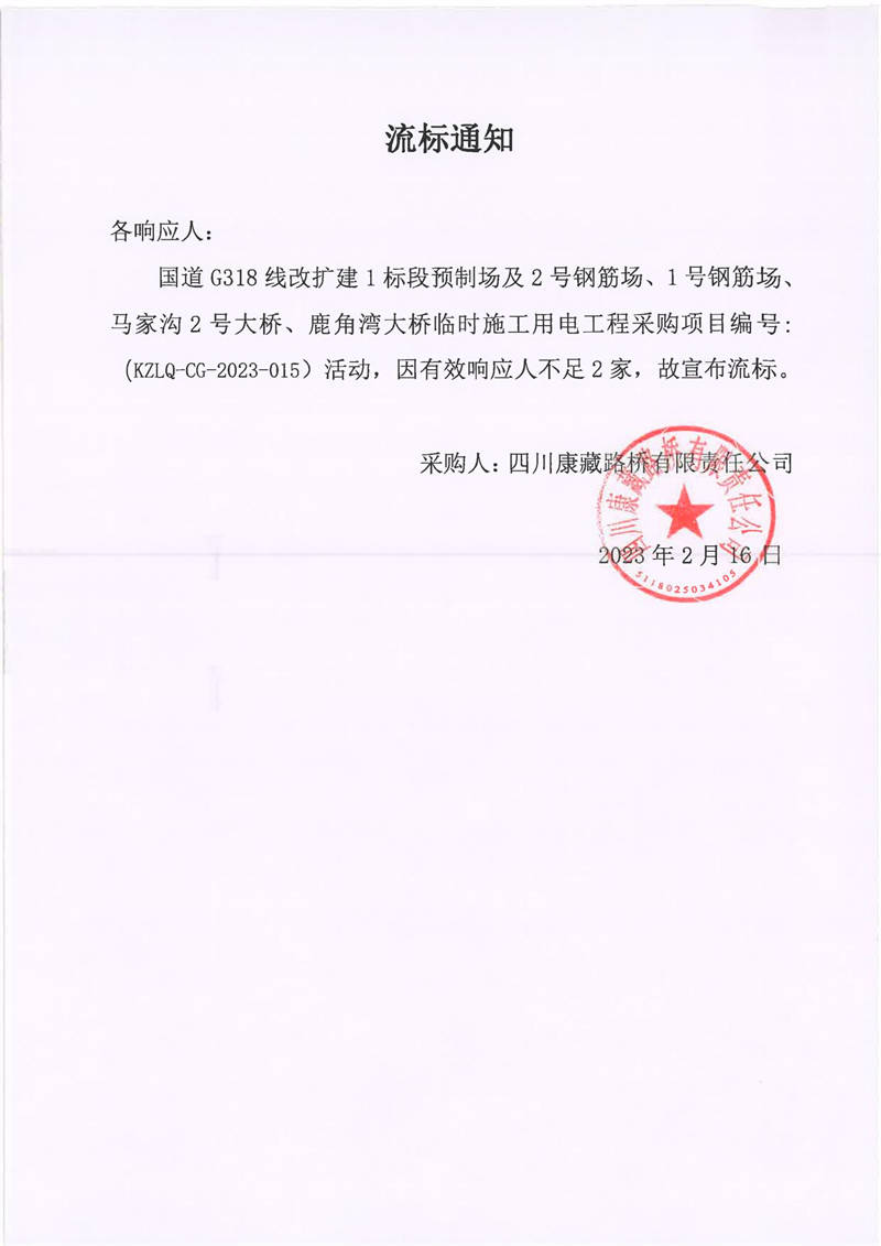 四川康藏路橋有限責(zé)任公司國道G318線改擴建1標(biāo)段預(yù)制場及2號鋼筋場、1號鋼筋場、馬家溝2號大橋、鹿角灣大橋臨時施工用電工程采購項目流標(biāo)通知