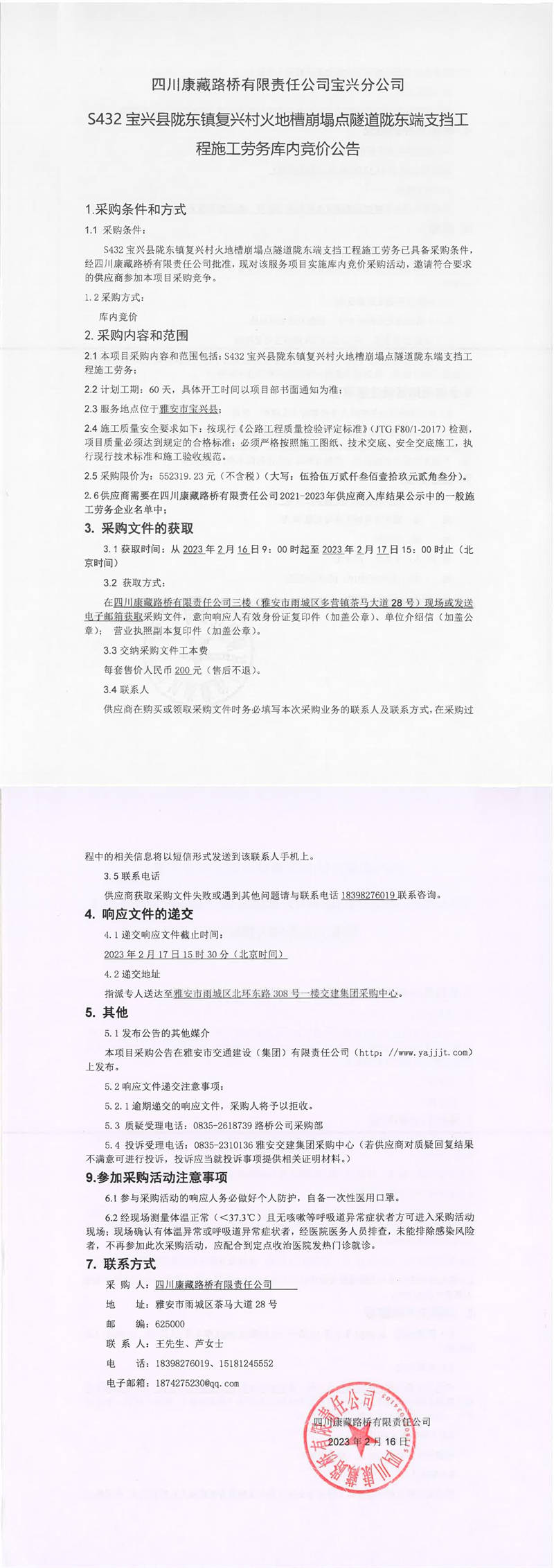 四川康藏路橋有限責任公司寶興分公司S432寶興縣隴東鎮(zhèn)復(fù)興村火地槽崩塌點隧道隴東端支擋工程施工勞務(wù)庫內(nèi)競價公告