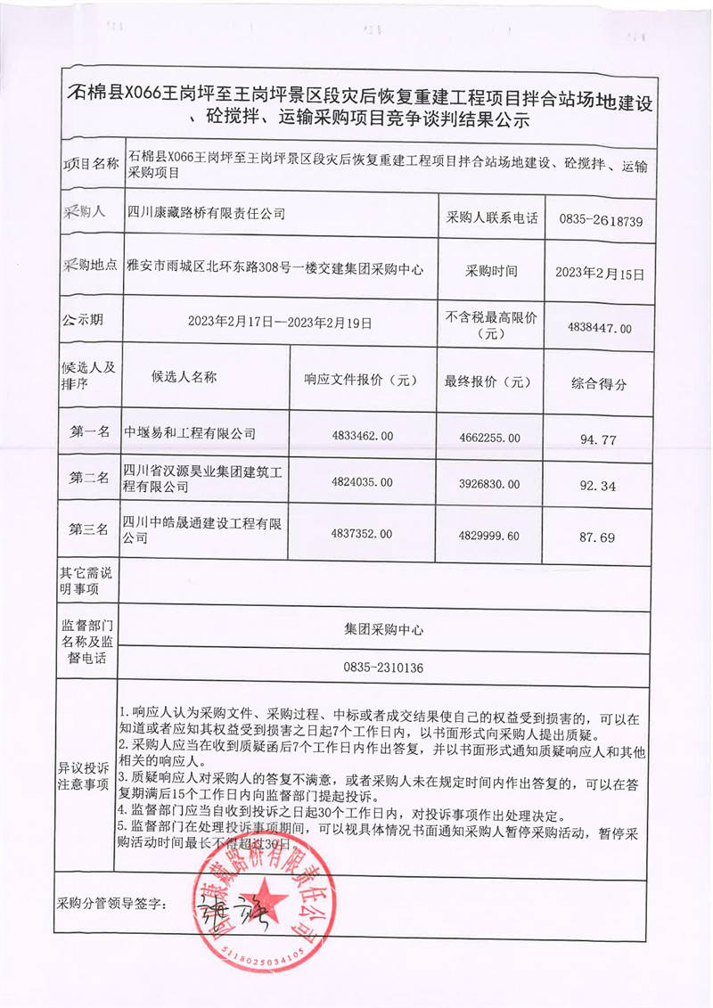 四川康藏路橋有限責(zé)任公司石棉縣X066王崗坪至王崗坪景區(qū)段災(zāi)后恢復(fù)重建工程項(xiàng)目拌合站場(chǎng)地建設(shè)、砼攪拌、運(yùn)輸采購項(xiàng)目競(jìng)爭(zhēng)談判結(jié)果公示