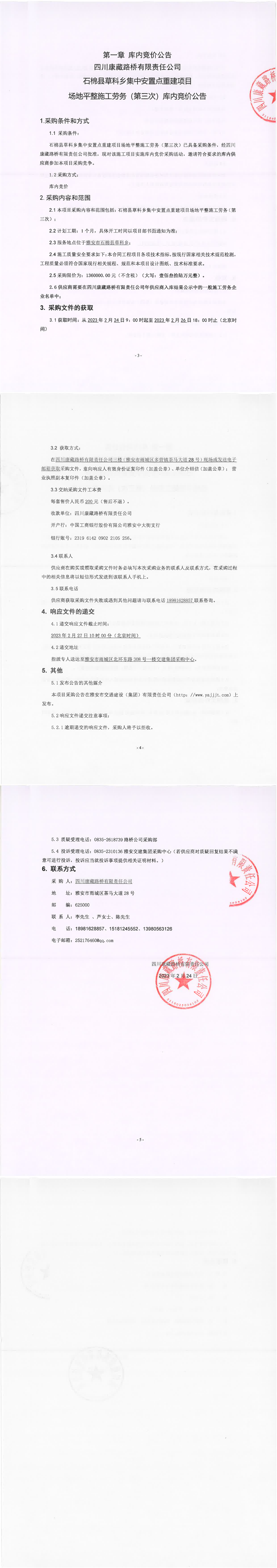四川康藏路橋有限責(zé)任公司石棉縣草科鄉(xiāng)集中安置點(diǎn)重建項(xiàng)目場地平整施工勞務(wù)(第三次)庫內(nèi)競價(jià)