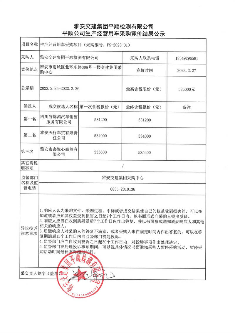 雅安交建集團(tuán)平順檢測(cè)有限公司平順公司生產(chǎn)經(jīng)營用車采購競(jìng)價(jià)結(jié)果公示