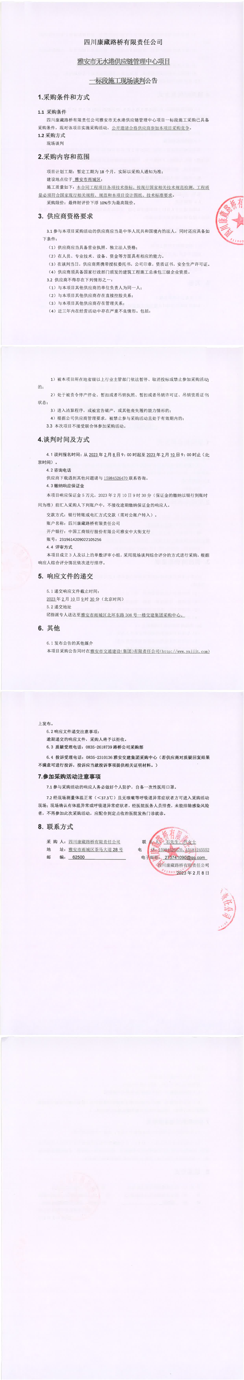四川康藏路橋有限責(zé)任公司雅安市無水港供應(yīng)鏈管理中心項目一標段施工現(xiàn)場談判公告