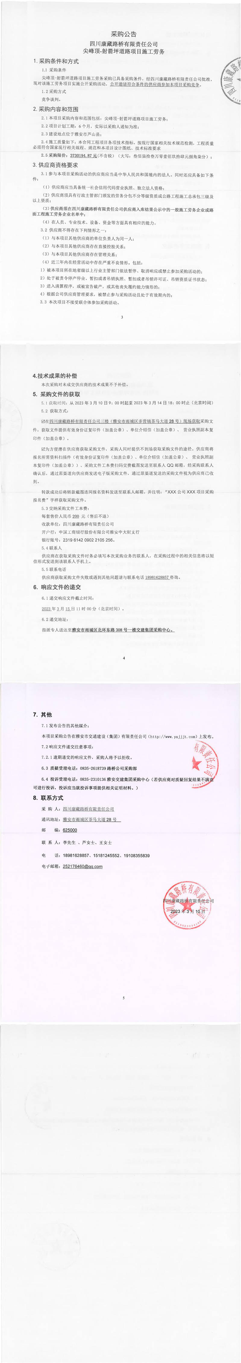 四川康藏路橋有限責任公司尖峰頂-射箭坪道路項目施工勞務(wù)采購公告