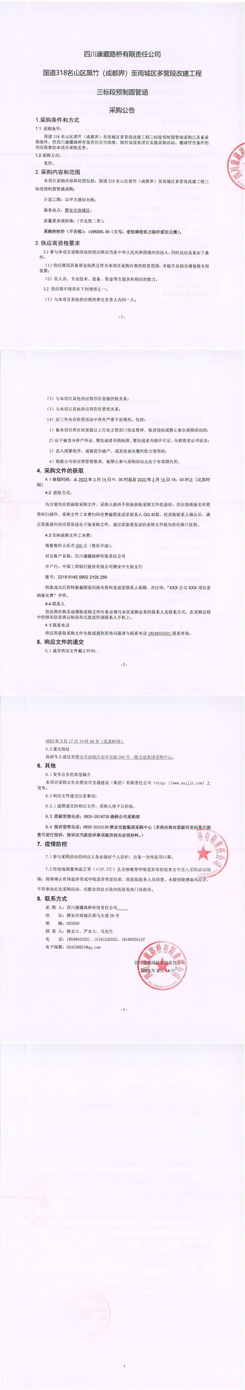 四川康藏路橋有限責(zé)任公司國道318名山區(qū)黑竹(成都界)至雨城區(qū)多營段改建工程三標(biāo)段預(yù)制圓管涵采購公告