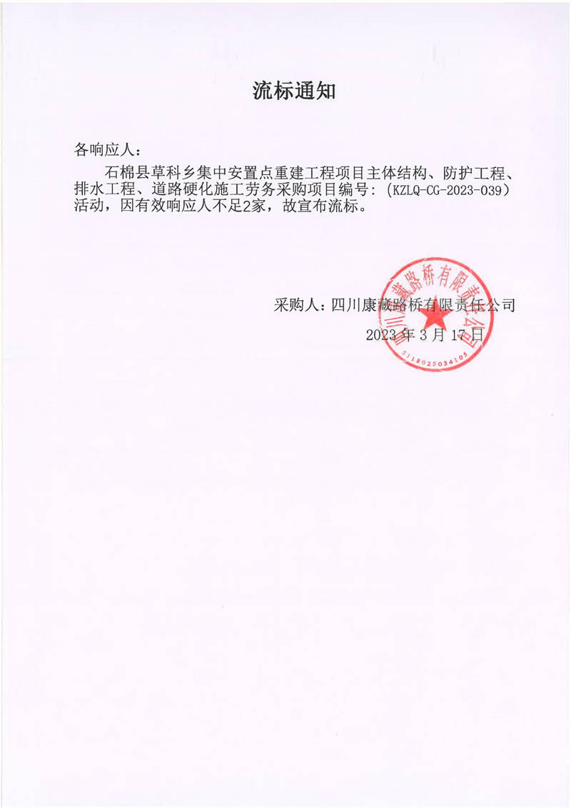 四川康藏路橋有限責任公司石棉草科鄉(xiāng)集中安置點重建工程項目主體結(jié)構(gòu)、防護工程、排水工程、道路硬化施工勞務(wù)采購流標通知