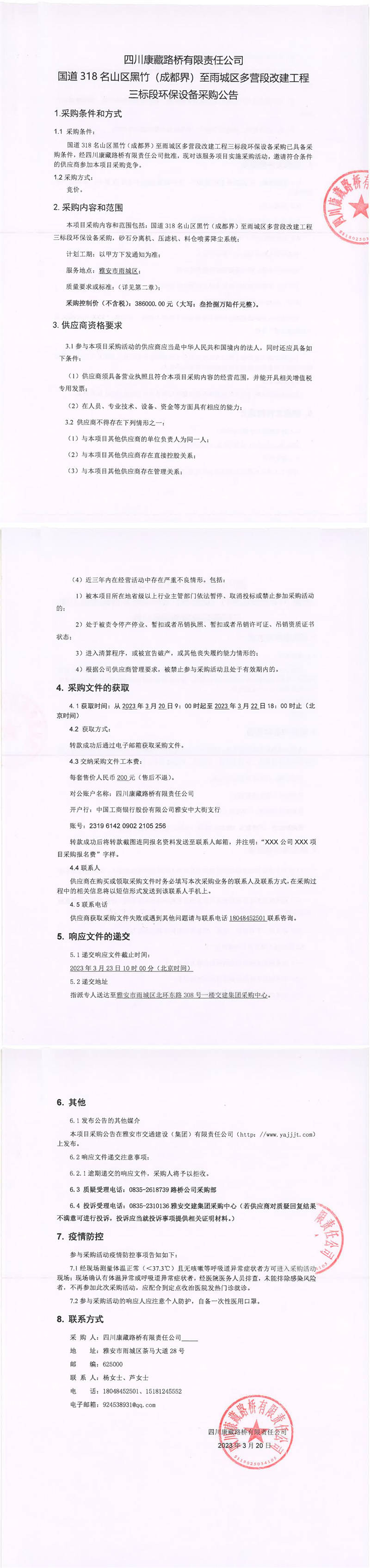 四川康藏路橋有限責任公司國道318名山區(qū)黑竹(成都界)至雨城區(qū)多營段改建工程三標段環(huán)保設備采購公告