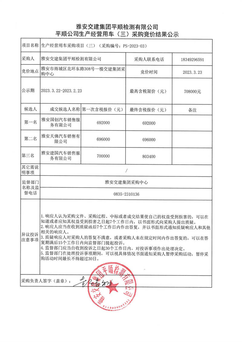 雅安交建集團平順檢測有限公司平順公司生產(chǎn)經(jīng)營用車(二)采購競價結(jié)果公示