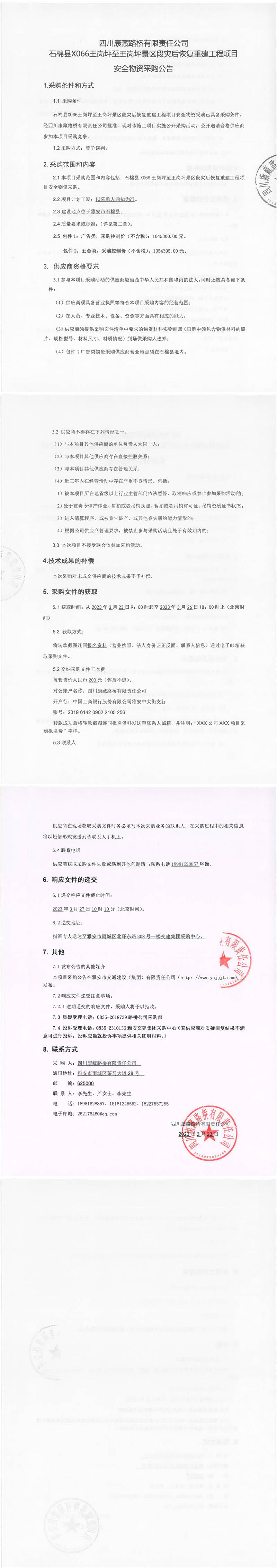 四川康藏路橋有限責任公司石棉縣X066王崗坪至王崗坪景區(qū)段災后恢復重建工程項目安全物資采購公告