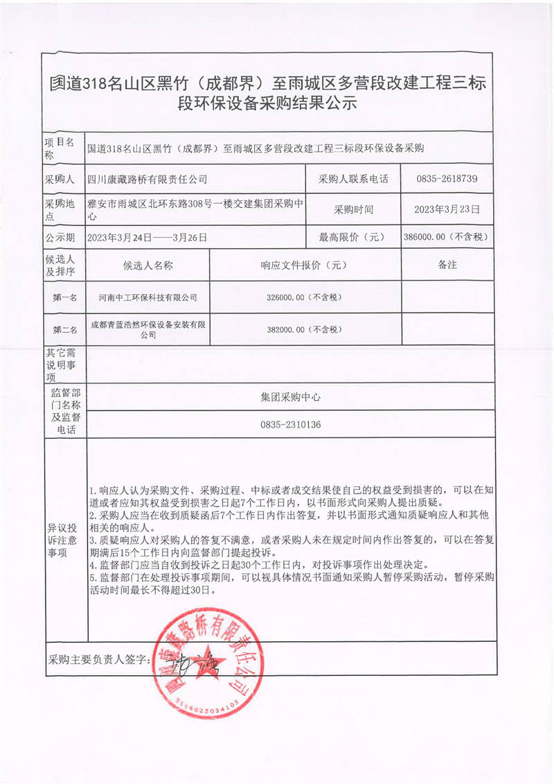四川康藏路橋有限責(zé)任公司國道318名山區(qū)黑竹(成都界)至雨城區(qū)多營段改建工程三標段環(huán)保設(shè)備采購結(jié)果公示