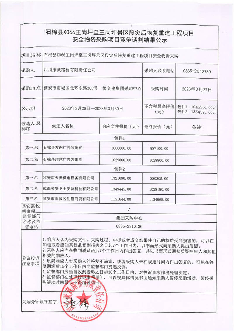 四川康藏路橋有限責(zé)任公司石棉縣X066王崗坪至王崗坪景區(qū)段災(zāi)后恢復(fù)重建工程項(xiàng)目安全物資采購(gòu)項(xiàng)目競(jìng)爭(zhēng)談判結(jié)果公示