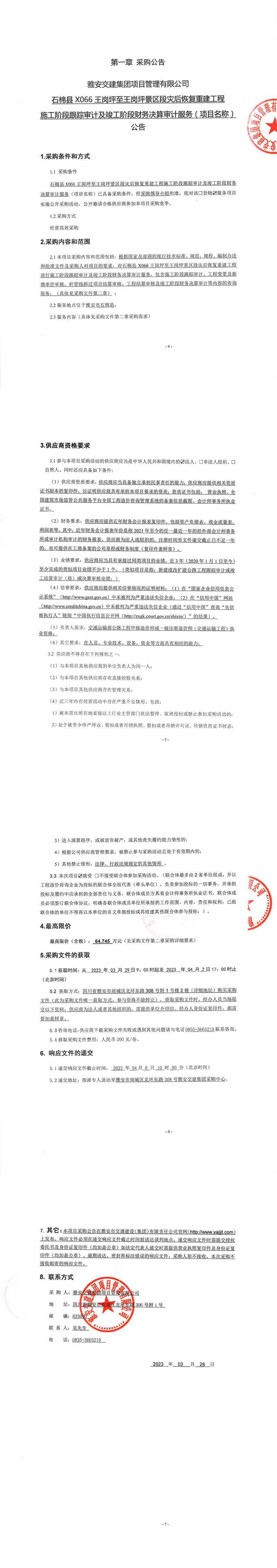 雅安交建集團項目管理有限公司石棉縣X066王崗坪至王崗坪景區(qū)段災后恢復重建工程施工階段跟蹤審計及竣工階段財務決算審計服務(項目名稱)公告