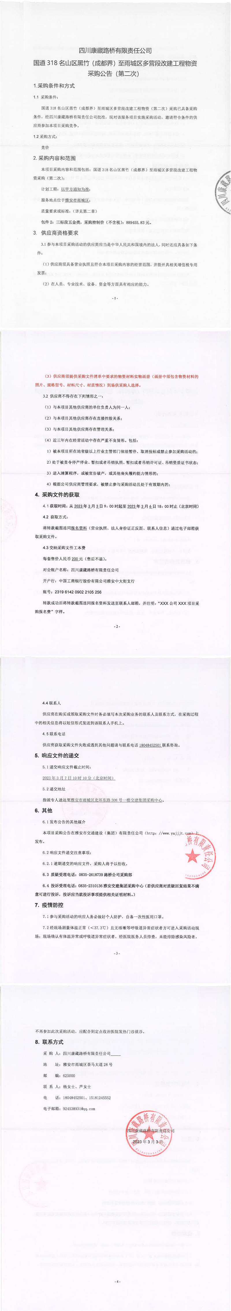四川康藏路橋有限責(zé)任公司國道318名山區(qū)黑竹(成都界)至雨城區(qū)多營段改建工程物資采購公告(第二次)