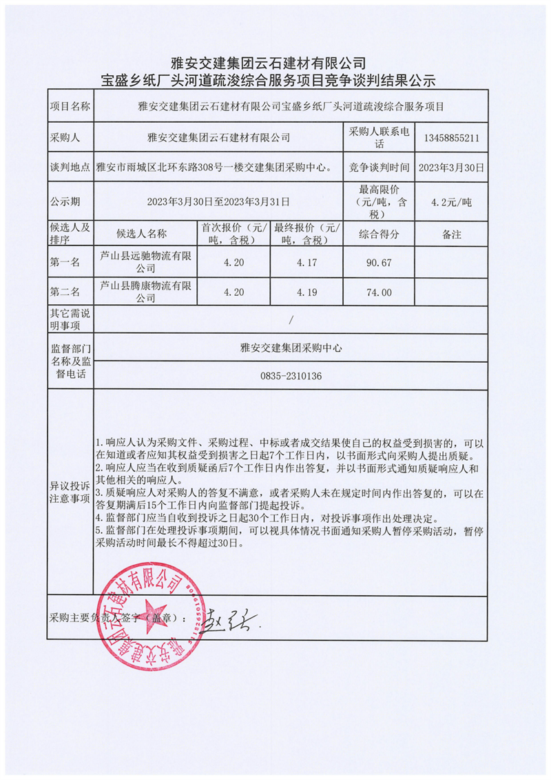 雅安交建集團(tuán)云石建材有限公司寶盛鄉(xiāng)紙廠頭河道疏浚綜合服務(wù)項(xiàng)目競爭談判結(jié)果公示