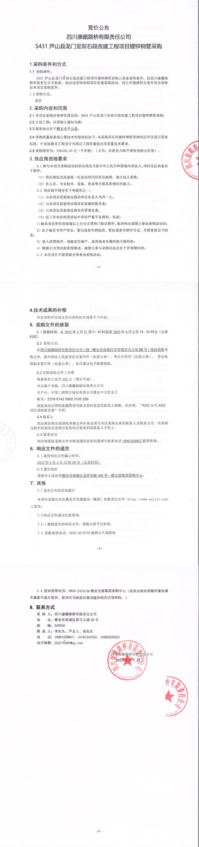 四川康藏路橋有限責(zé)任公司S431蘆山縣龍門至雙石段改建工程項目鍍鋅鋼管采購競價公告