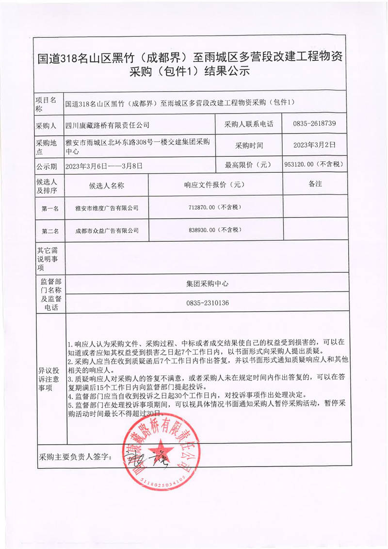四川康藏路橋有限責(zé)任公司國(guó)道318名山區(qū)黑竹(成都界)至雨城區(qū)多營(yíng)段改建工程物資采購(gòu)(包件1)結(jié)果公示