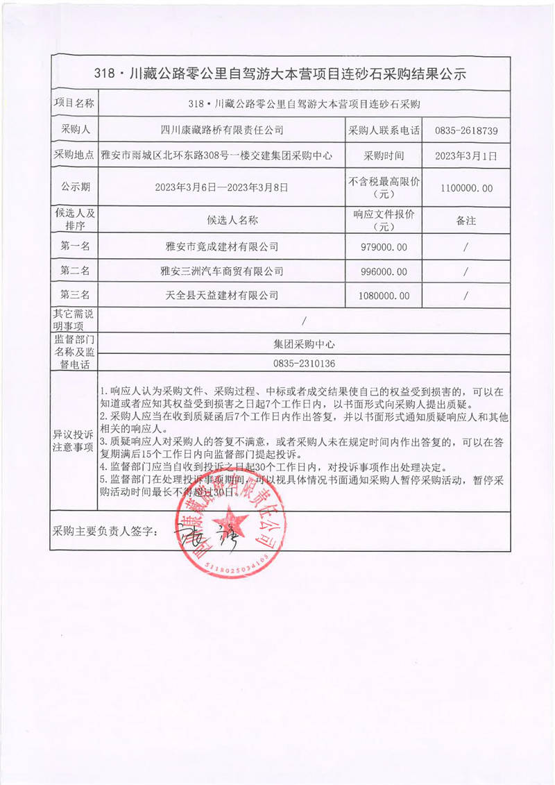 四川康藏路橋有限責(zé)任公司國(guó)道318名山區(qū)黑竹(成都界)至雨城區(qū)多營(yíng)段改建工程物資采購(包件1)結(jié)果公示
