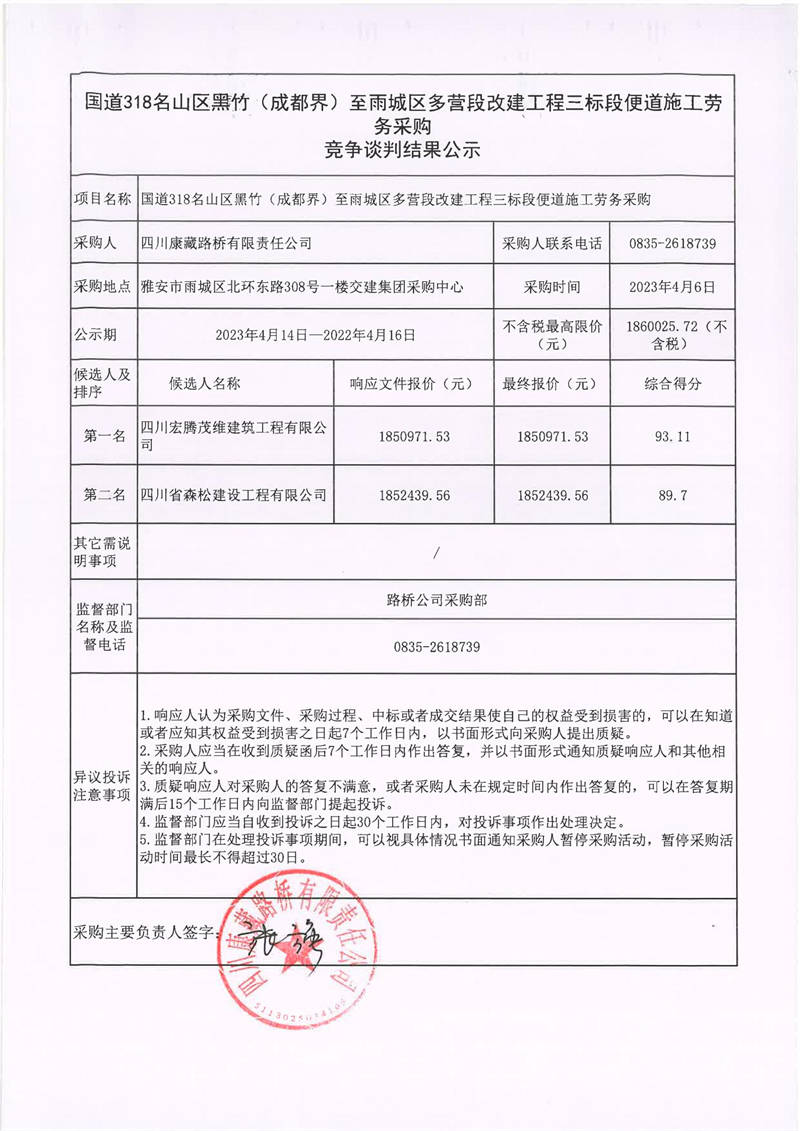 四川康藏路橋有限責(zé)任公司國(guó)道318名山區(qū)黑竹(成都界)至雨城區(qū)多營(yíng)段改建工程三標(biāo)段便道施工勞務(wù)采購(gòu)結(jié)果公示