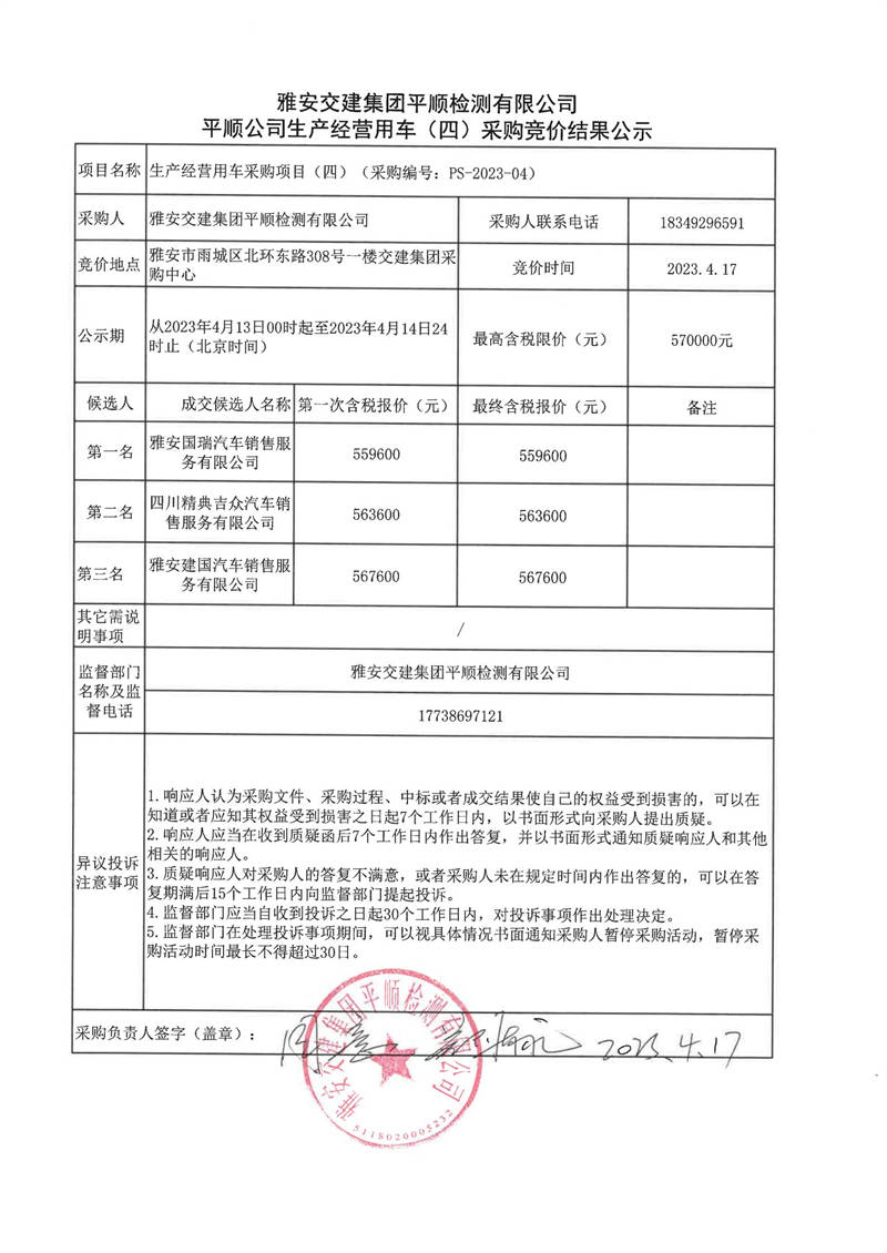 雅安交建集團(tuán)平順檢測(cè)有限公司平順公司生產(chǎn)經(jīng)營(yíng)用車(chē)(四)采購(gòu)競(jìng)價(jià)結(jié)果公示