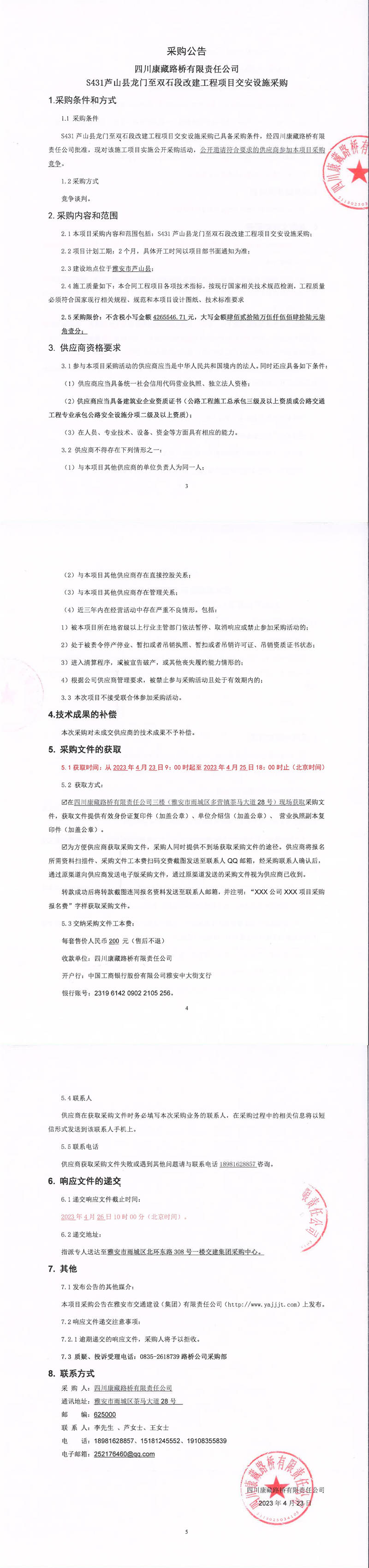 四川康藏路橋有限責(zé)任公司S431蘆山縣龍門至雙石段改建工程項(xiàng)目交安設(shè)施采購(gòu)