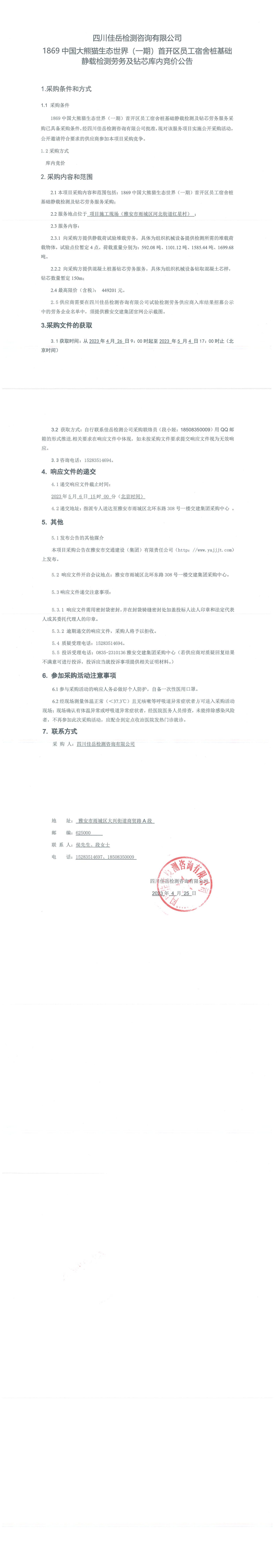 四川佳岳檢測(cè)咨詢有限公司1869中國(guó)大熊貓生態(tài)世界(一期)首開(kāi)區(qū)員工宿舍樁基礎(chǔ)靜載檢測(cè)勞務(wù)及磚芯庫(kù)內(nèi)競(jìng)價(jià)公告