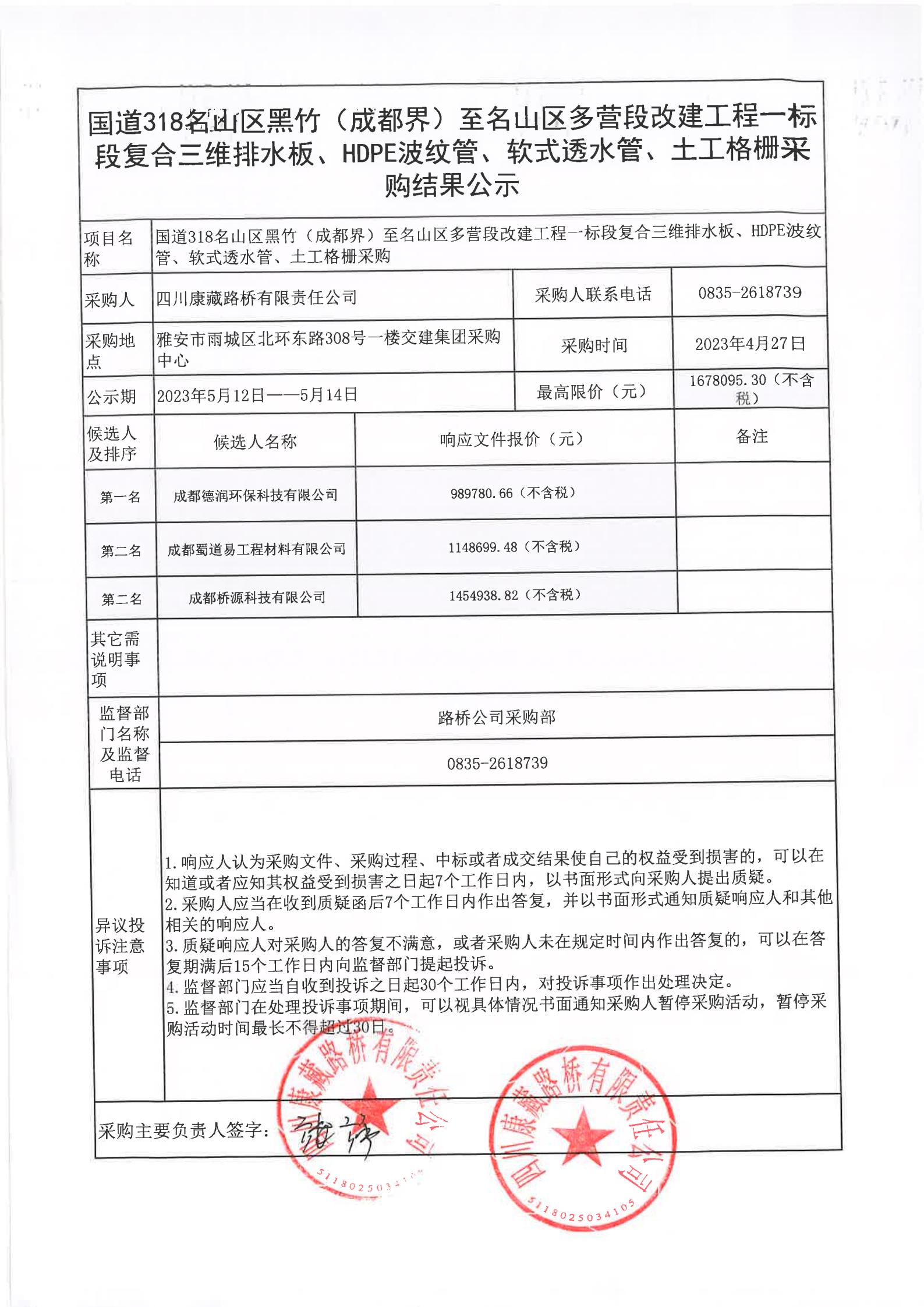 四川康藏路橋有限責任公司國道318名山區(qū)黑竹(成都界)至雨城區(qū)多營段改建工程一標段復合三維排水板、HDPE波紋管、軟式透水管、土工格柵采購結果公示