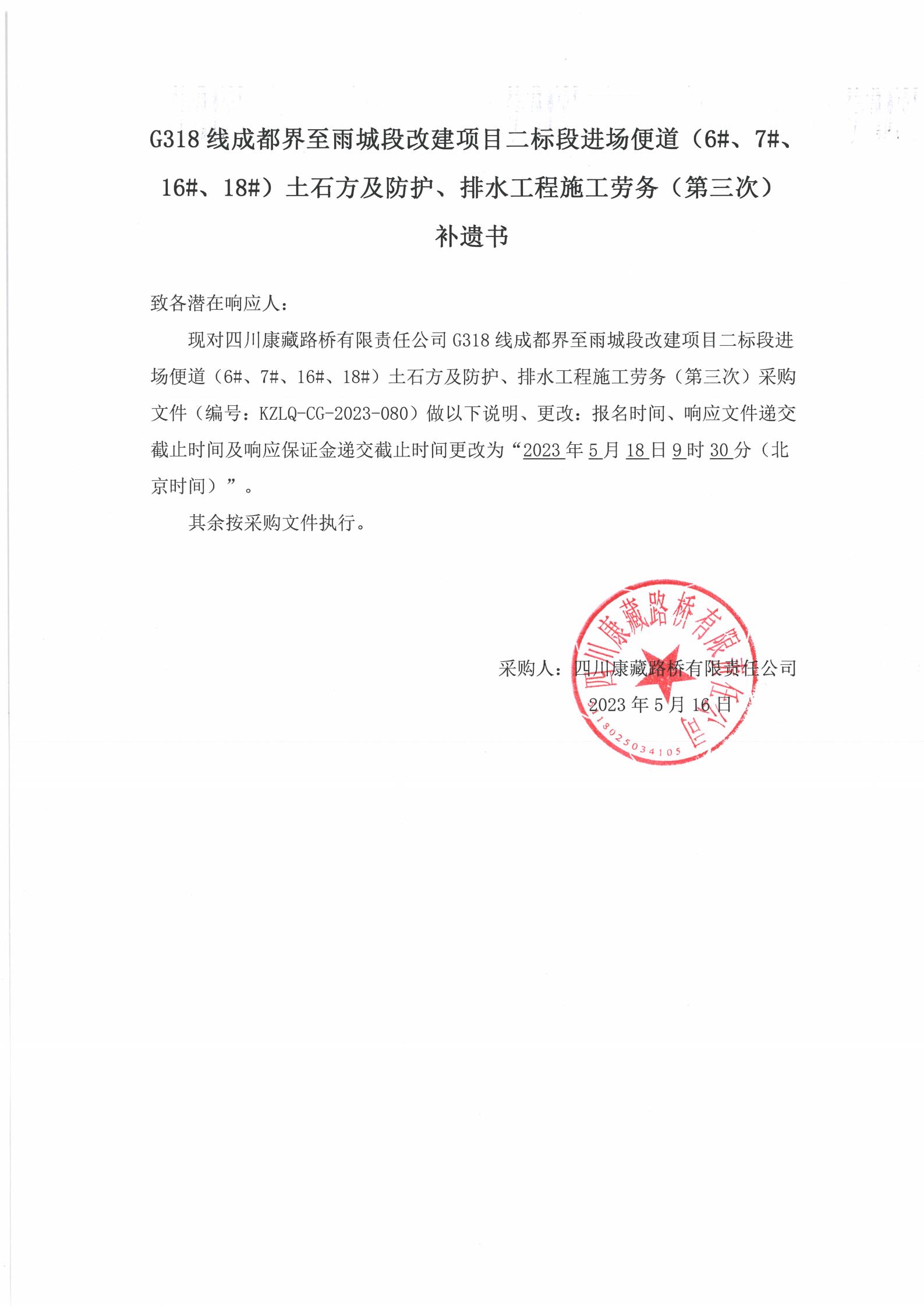 四川康藏路橋有限責(zé)任公司國(guó)道318名山區(qū)黑竹(成都界)至雨城區(qū)多營(yíng)段改建工程二標(biāo)段橋梁下部構(gòu)造施工勞務(wù)(第二次)補(bǔ)遺書