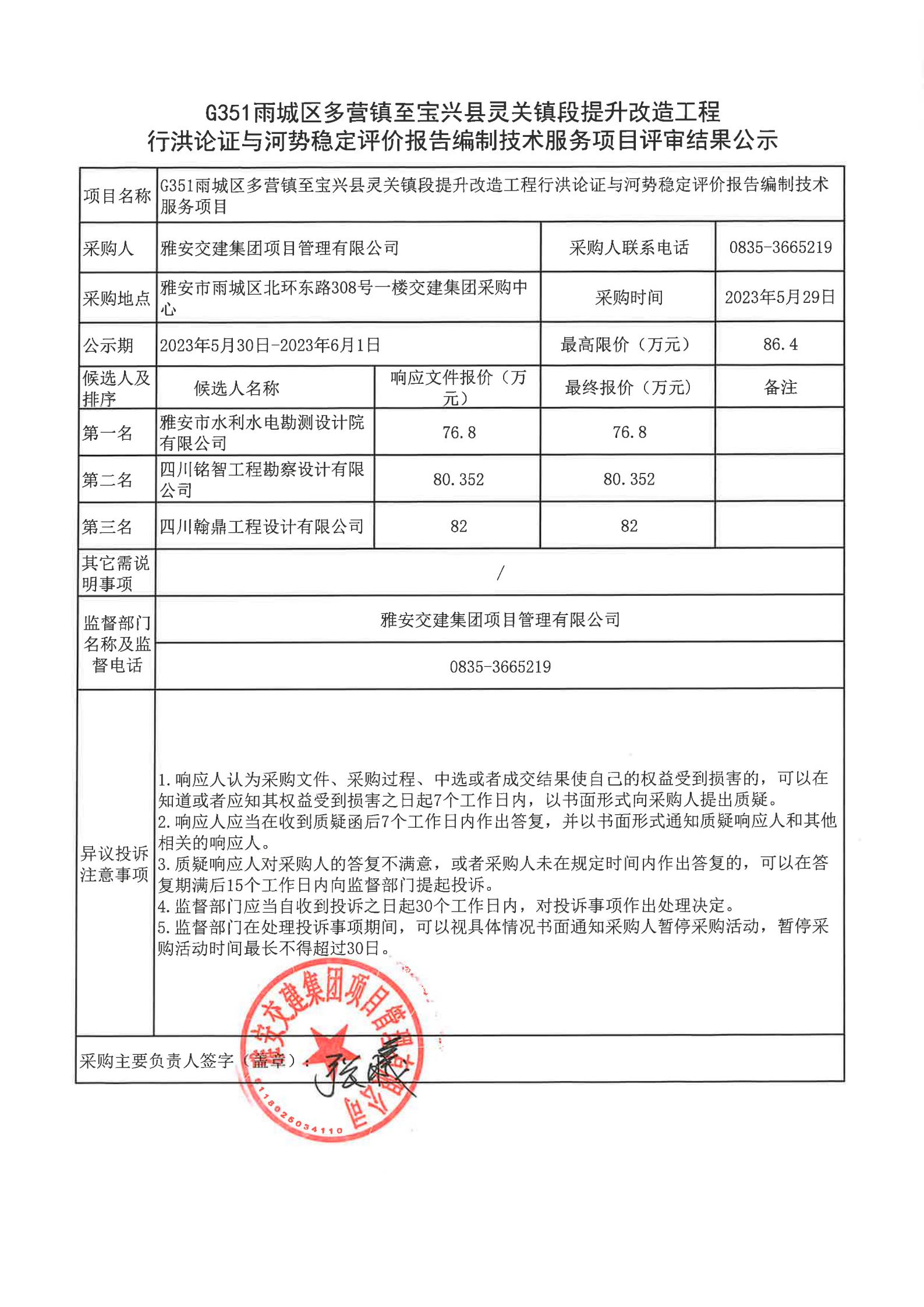 雅安交建集團(tuán)項(xiàng)目管理有限公司G351雨城區(qū)多營鎮(zhèn)至寶興縣靈關(guān)鎮(zhèn)段提升改造工程行洪論證與河勢穩(wěn)定評價(jià)報(bào)告編制技術(shù)服務(wù)項(xiàng)目評審結(jié)果公示