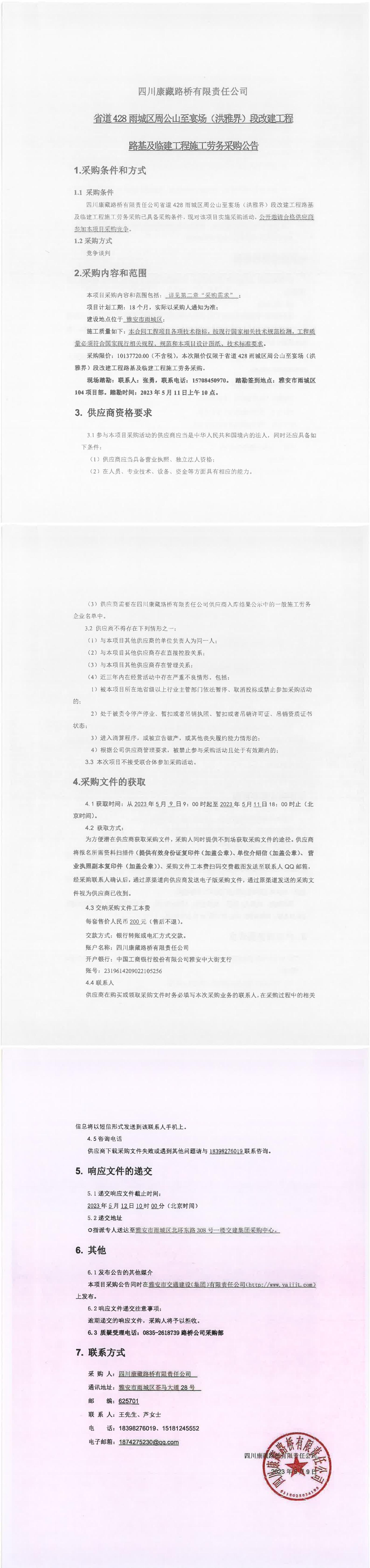 四川康藏路橋有限責任公司省道428雨城區(qū)周公山至宴場(洪雅界)段改建工程路基及臨建工程施工勞務采購公告