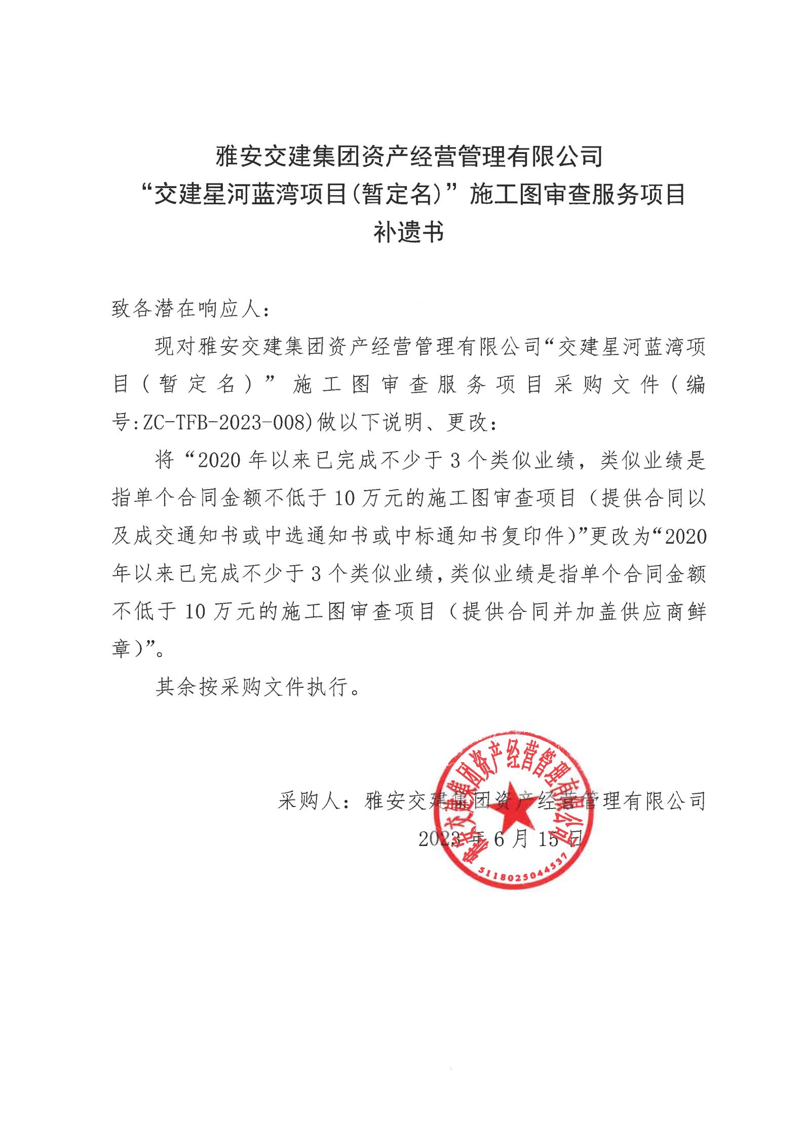 雅安交建集團(tuán)資產(chǎn)經(jīng)營管理有限公司“交建星河藍(lán)灣項目(暫定名)”施工圖審查服務(wù)項目采購補(bǔ)遺書