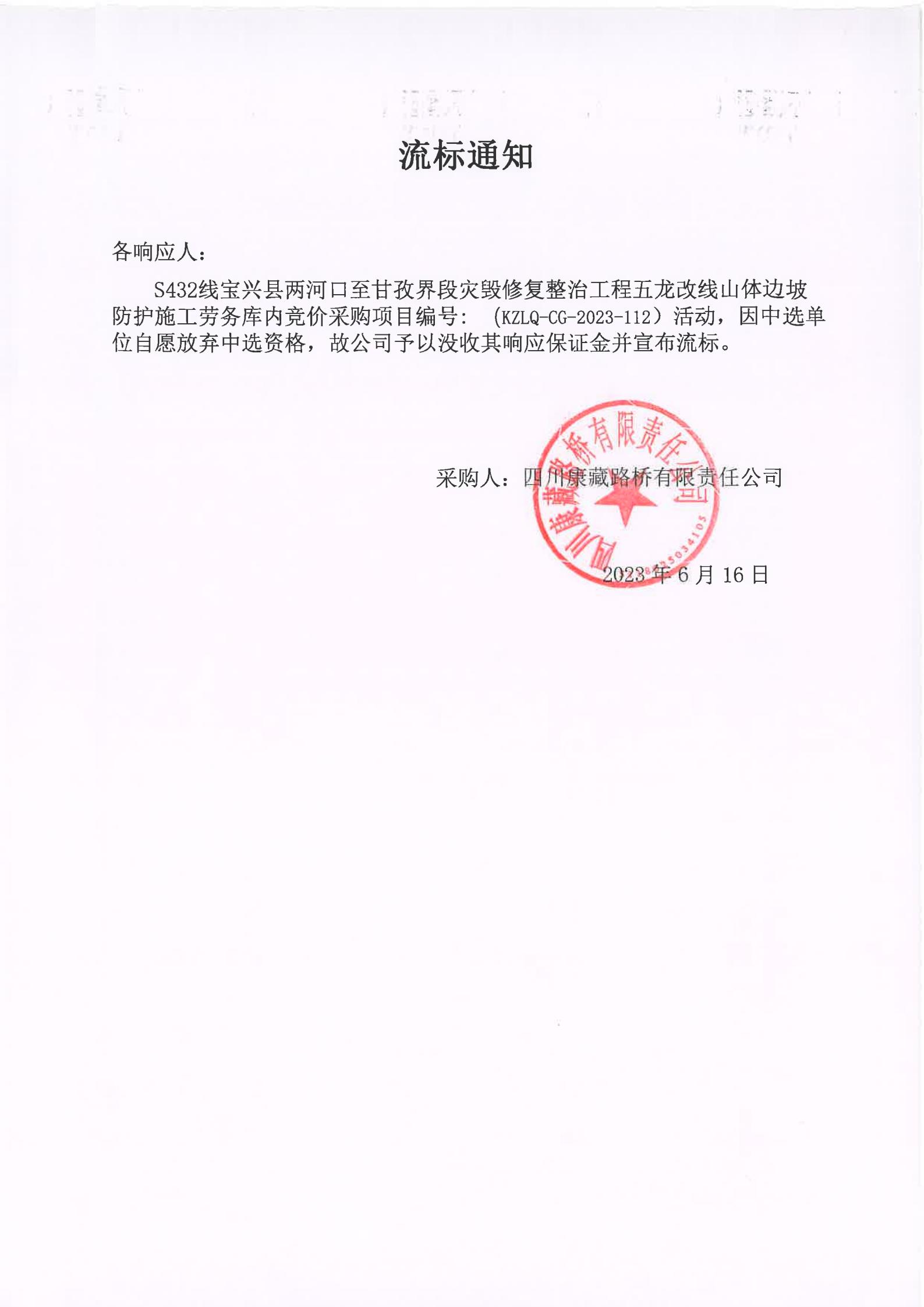 四川康藏路橋有限責(zé)任公司S432線寶興縣兩河口至甘孜界段災(zāi)毀修復(fù)整治工程五龍改線山體邊坡防護施工勞務(wù)庫內(nèi)競價流標通知
