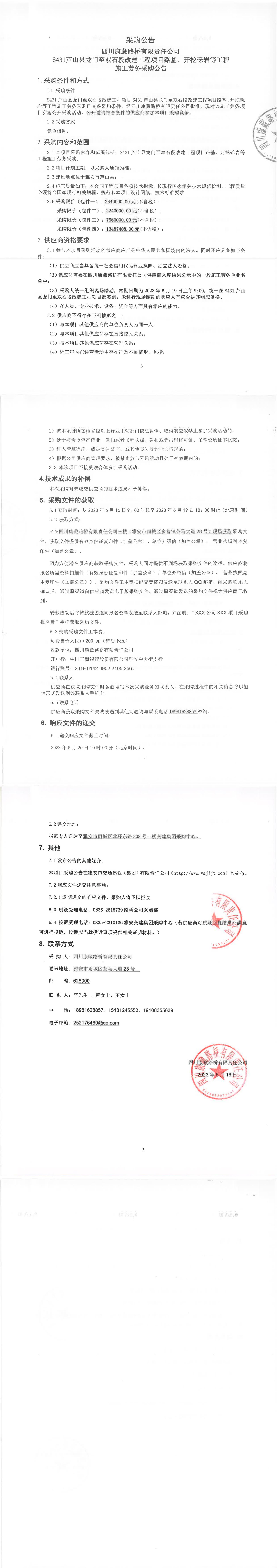 四川康藏路橋有限責(zé)任公司S431蘆山縣龍門至雙石段改建工程項(xiàng)目路基、開(kāi)挖礫巖等工程施工勞務(wù)采購(gòu)公告