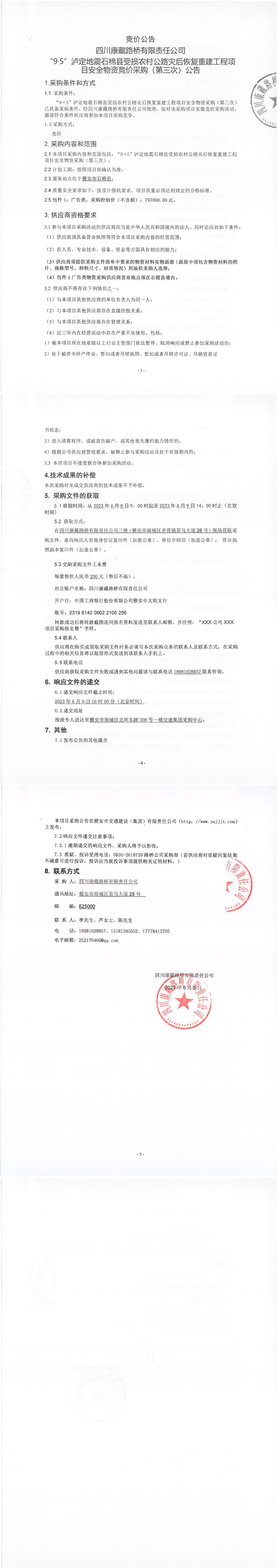 四川康藏路橋有限責(zé)任公司“9·5”瀘定地震石棉縣受損農(nóng)村公路災(zāi)后恢復(fù)重建工程項(xiàng)目安全物資競(jìng)價(jià)采購(gòu)(第三次)公告