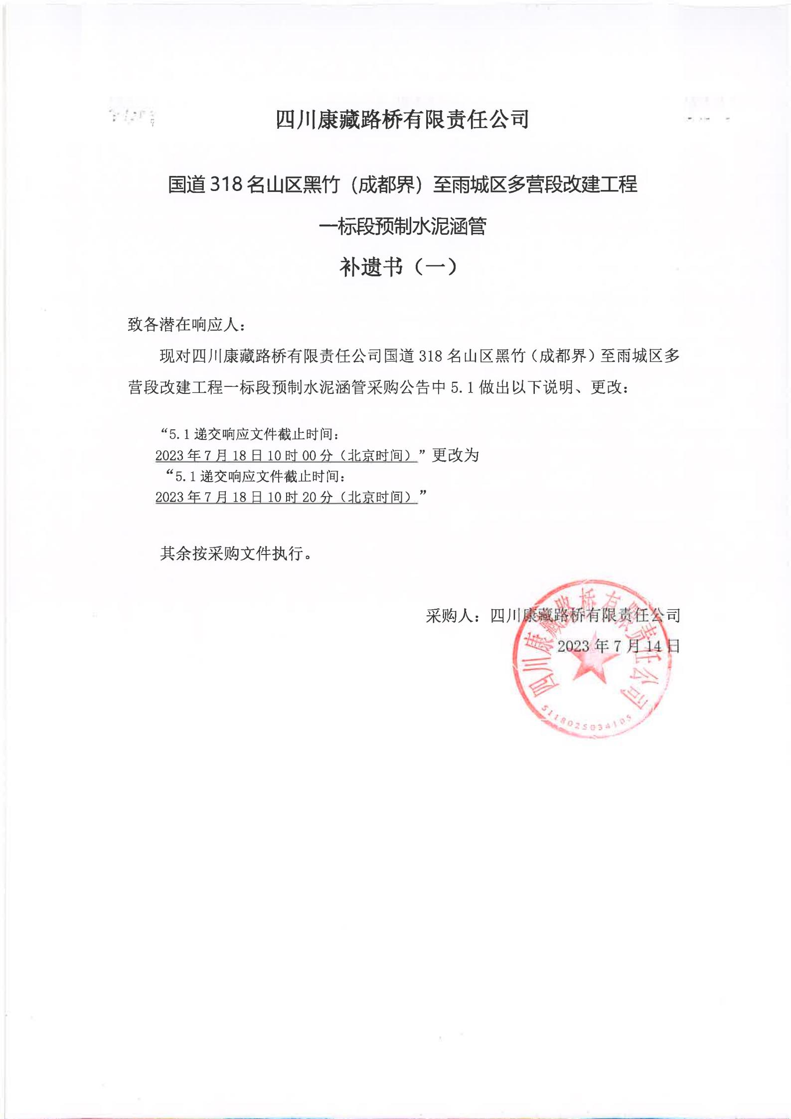 四川康藏路橋有限責(zé)任公司國道318名山區(qū)黑竹(成都界)至雨城區(qū)多營段改建工程一標(biāo)段預(yù)制水泥涵管(補遺書)(一)