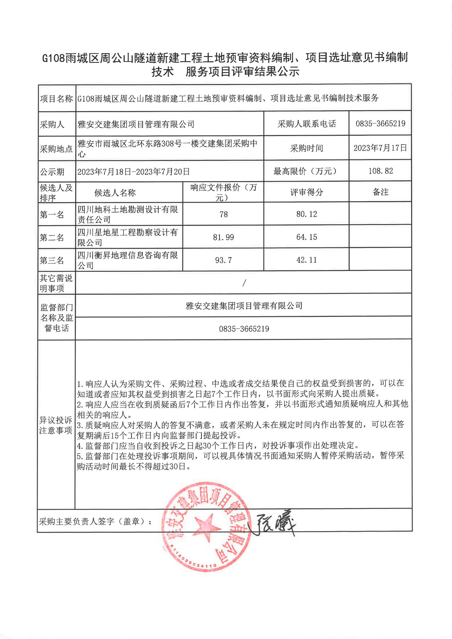 雅安交建集團項目管理有限公司G108雨城區(qū)周公山隧道新建工程土地預審資料編制、項目選址意見書編制技術服務項目評審結果公示