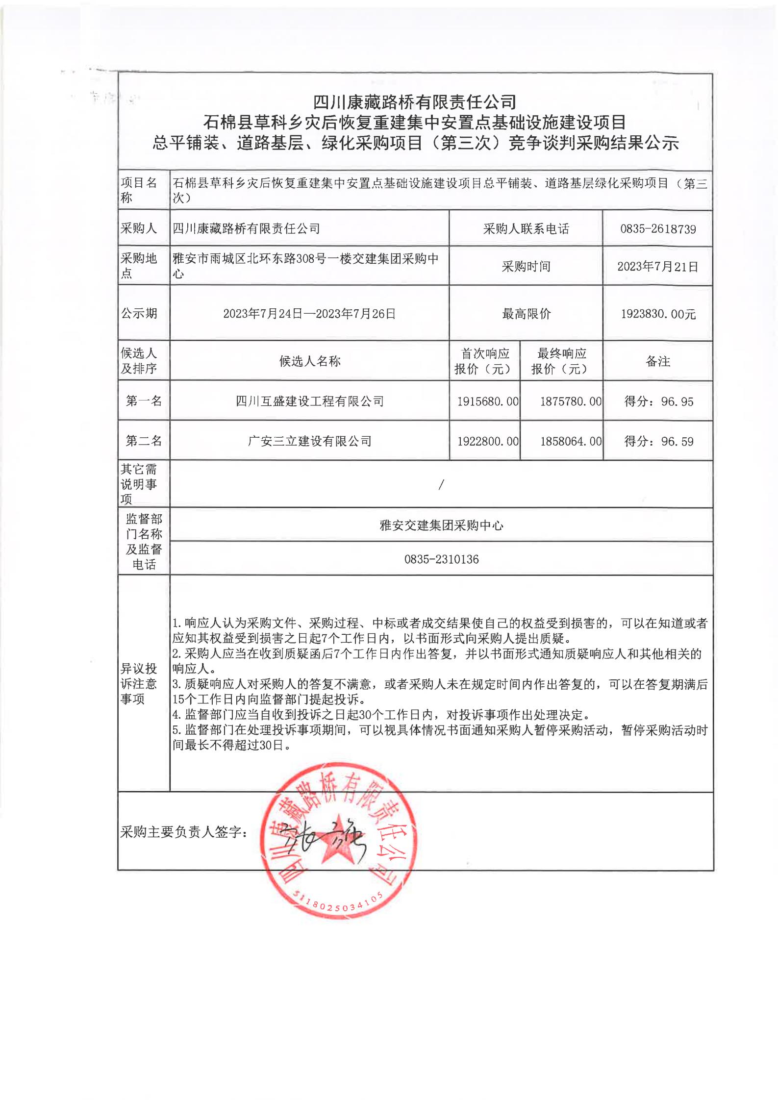 四川康藏路橋有限責(zé)任公司石棉縣草科鄉(xiāng)災(zāi)后恢復(fù)重建集中安置點(diǎn)基礎(chǔ)設(shè)施建設(shè)項目總平鋪裝、道路基層、綠化采購項目(第三次)競爭談判采購結(jié)果公示