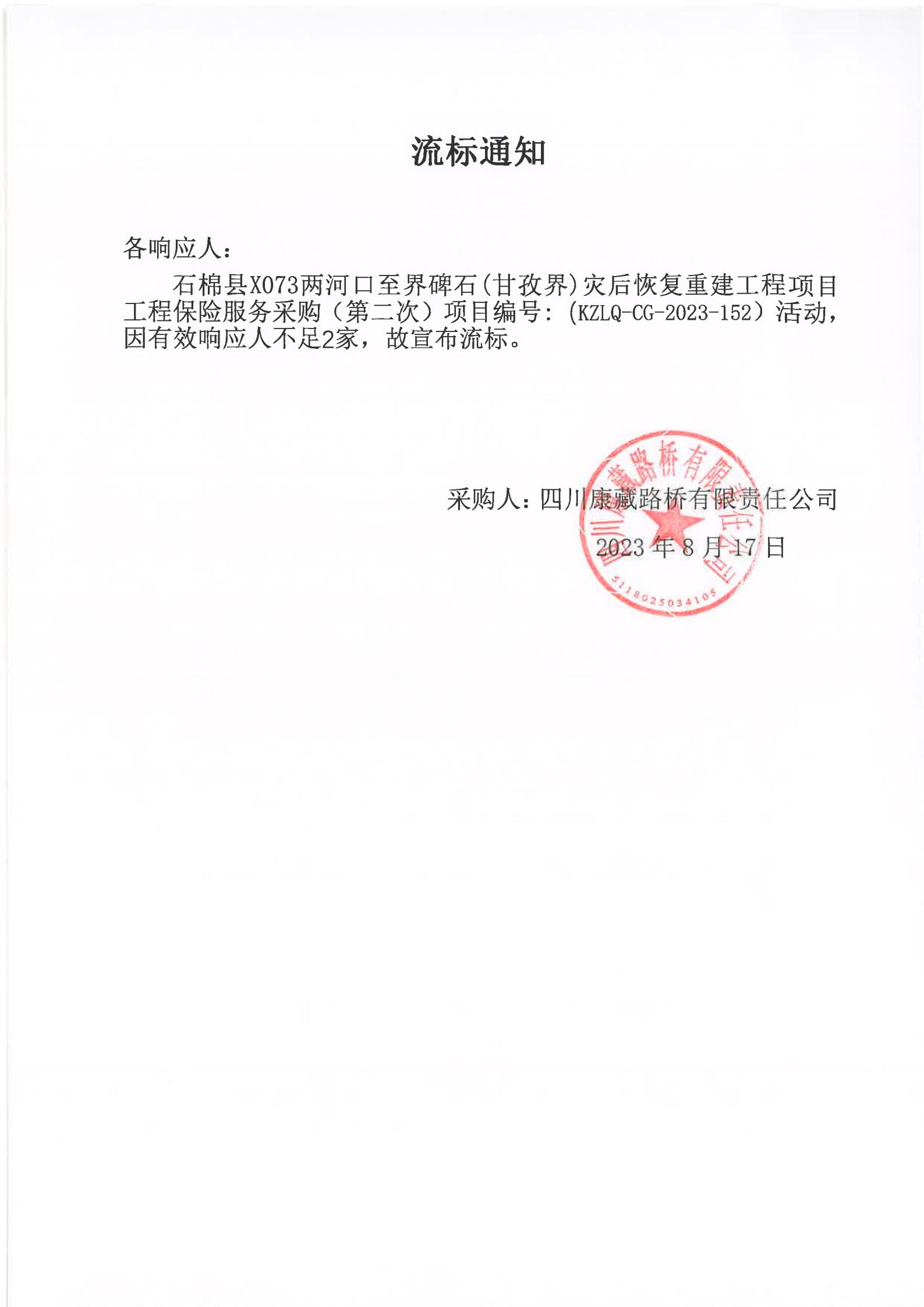 四川康藏路橋有限責任公司石棉縣X073兩河口至界碑石(甘孜界)災后恢復重建工程項目工程保險服務采購(第二次)流標通知
